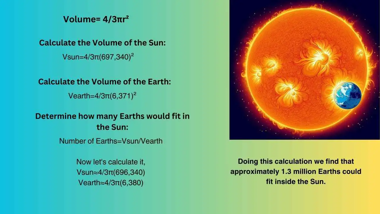 Doing this calculation we find that approximately 1.3 million Earths could fit inside the Sun