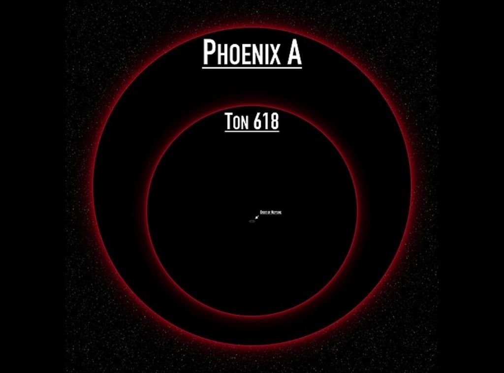 The Ton 618 black hole is over 60 billion times more massive than the sun. While Phoenix A black hole is 100 billion times more massive than the sun. So the Phoenix A black hole is about 40 times bigger than the Ton-618 black hole.